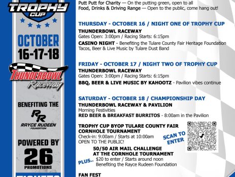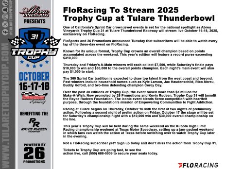 Joel Myers Jr. claims Trophy Cup title/ Tanner Holmes wins $10,000 main event Tulare, CA…Joel Myers Jr. charged from 24th to eighth in the main event on Saturday night at Tulare Thunderbowl Raceway, securing the $30,000 Abreu Vineyards Trophy Cup benefiting the Rayce Rudeen Foundation championship for the first time in his career. While Myers captured the title Jacksonville, Oregon’s Tanner Holmes picked up a thrilling late race win during the 50 lap Trophy Cup finale aboard the Tarlton & [...]