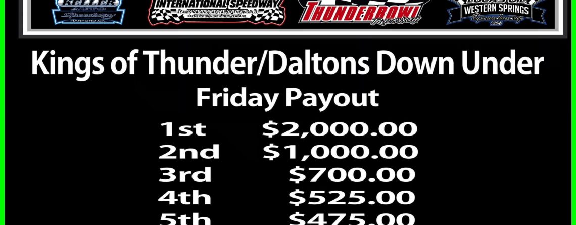 Thunderbowl Raceway this Friday and Saturday is Rounds one and two for the Kings of Thunder Dalton’s Down Under Tour! Opening night will offer $2,000-to-win/ $250-to-start, while Saturday’s finale dishes out $3,000-to-win/ $350-to-start.
