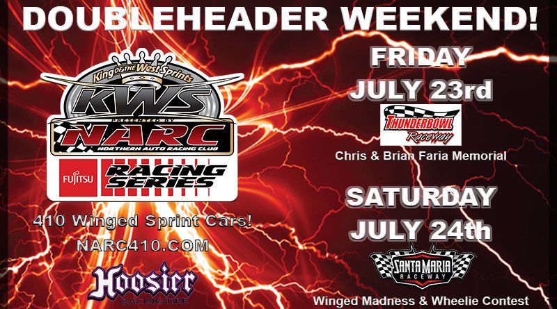 (7/19/21) Sacramento, CA … This weekend brings the second doubleheader of the 2021 NARC King of the West Fujitsu Sprint Car campaign with the “Chris and Brian Faria Memorial” at Tulare’s Thunderbowl Raceway kicking off two nights of racing on Friday, July 23rd. The following night, July 24th, showcases the “Winged Madness” night at Nipomo’s Santa Maria Raceway, in an event that will feature a Wheelie Contest.