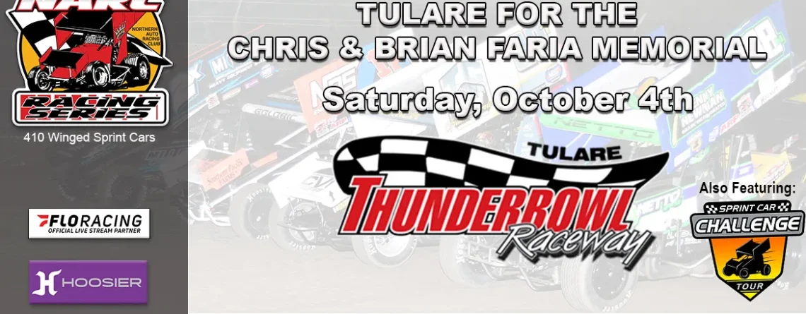 (9/30/25 – Andrew Kunas) Tulare, CA … The closing stretch of the 2025 NARC King of the West sprint car season is upon us. The first of four races in five weeks is this Saturday as the NARC teams tackle the famous Thunderbowl Raceway in Tulare for the Chris & Brian Faria Memorial.  This action-packed racing card will also feature the Sprint Car Challenge Tour 360’s.