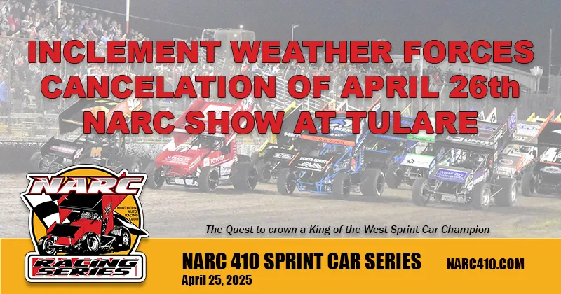 (4/25/25 – Jim Allen) Tulare, CA … Bad weather has officially washed out the April 26th NARC 410 Sprint Car Series show at the Thunderbowl Raceway in Tulare.  The Chris & Brian Faria Memorial also featured 360 sprint cars and the Racesavers divisions.