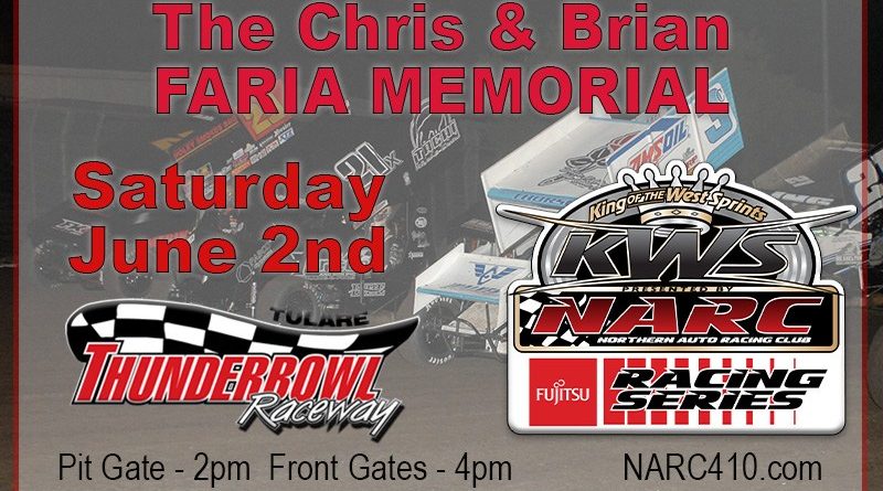 (5/29/18) Sacramento, CA … The 950-horsepower open wheel sprint cars of the King of the West-NARC Fujitsu Racing Series will make their final appearance of the season at the Tulare Thunderbowl Raceway on Saturday, June 2nd for the 17th Annual Brian & Chris Faria Memorial.
